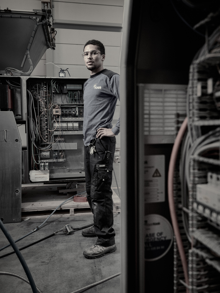 Ik doe bijna alles: samenstellen, opbouwen, testen, programmeren, installeren en storingen oplossen. Dat maakt het werk superafwisselend. Binnenkort mag ik doorgroeien naar de tekenkamer, maar eerlijk gezegd vind ik het sleutelen nog té leuk. Eén ding weet ik zeker: hier wil ik blijven. De industriële automatisering past echt bij mij.’